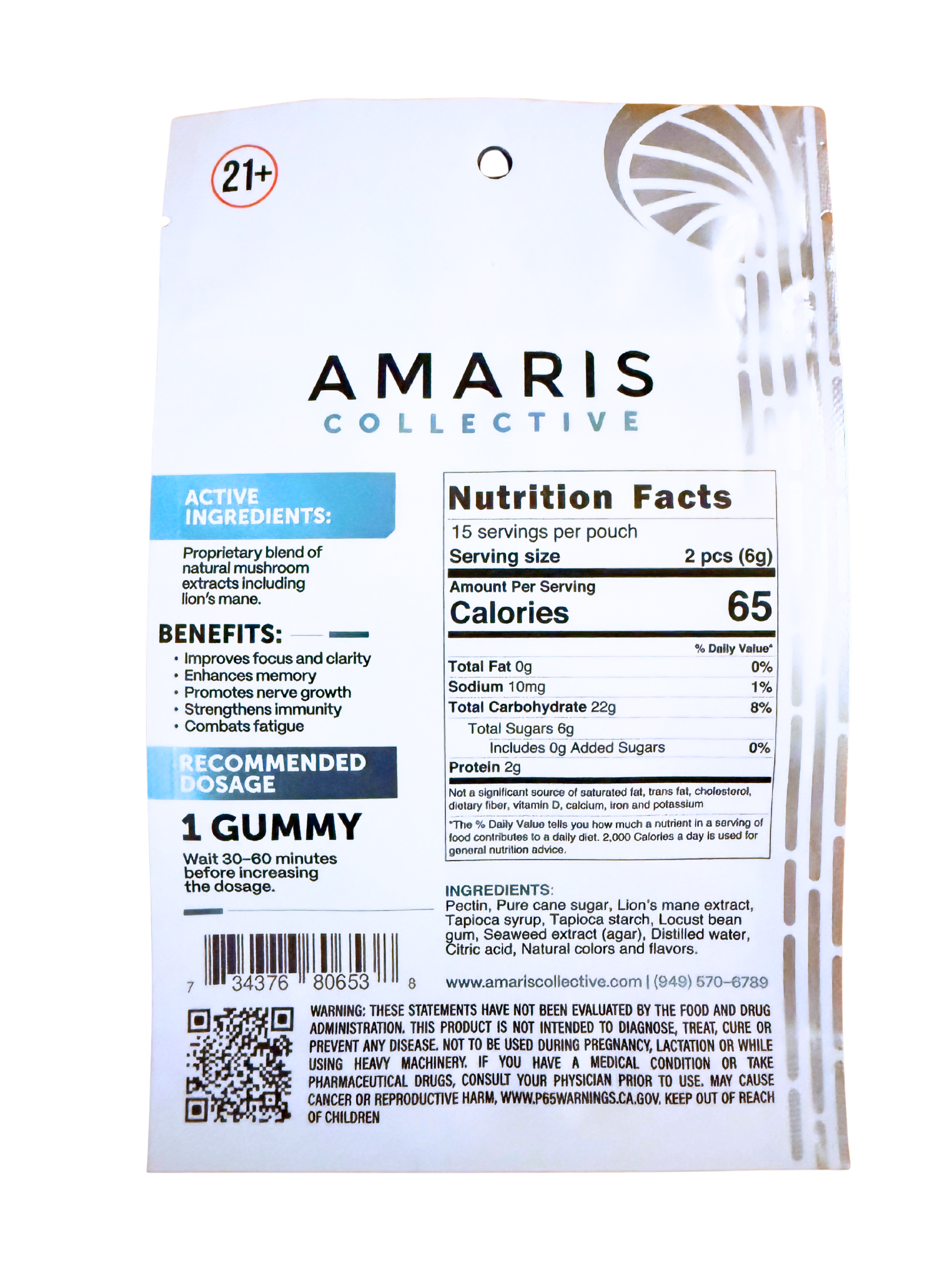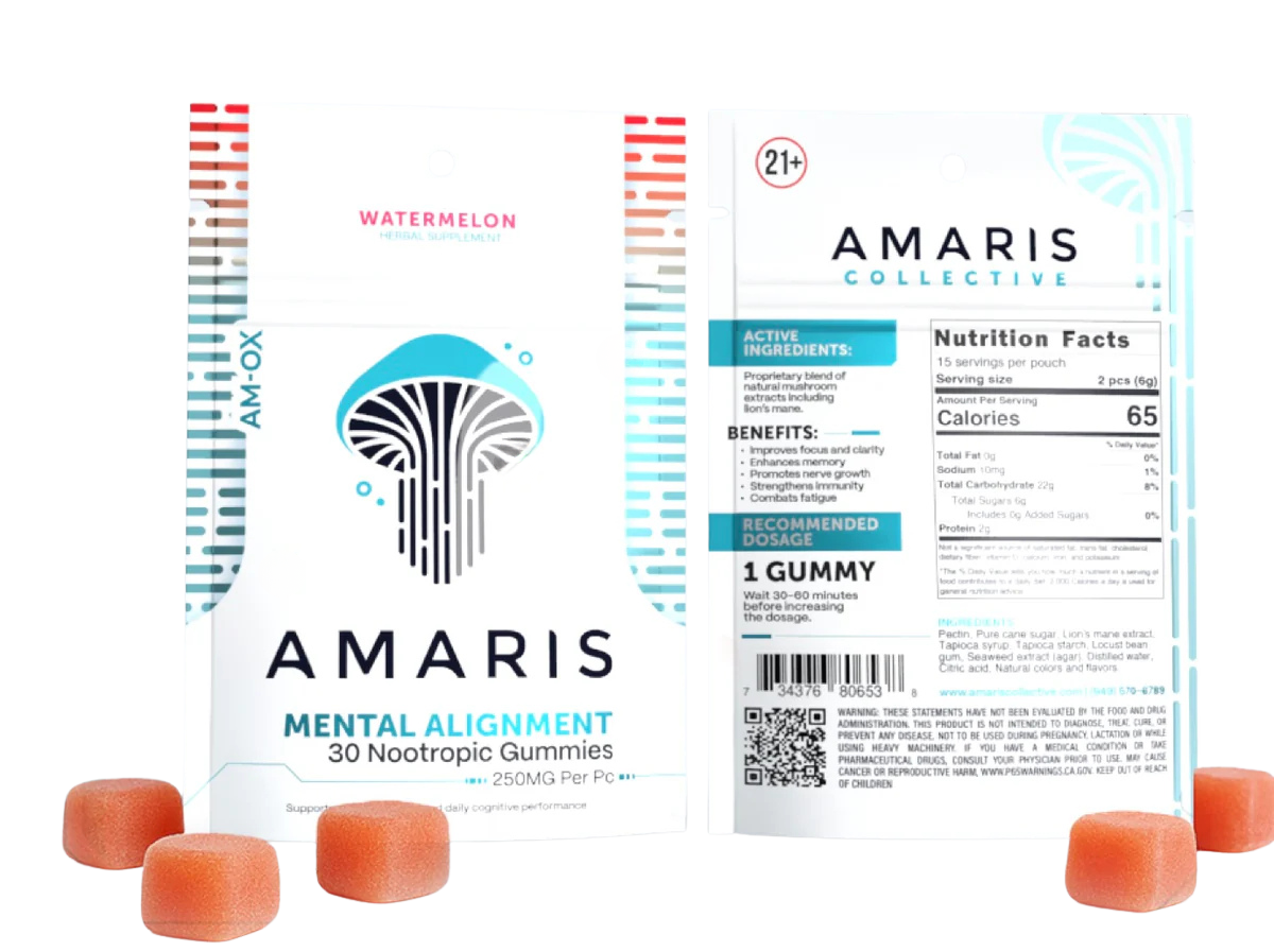 Amaris gummies use a proprietary blend called AM-0X™ — a “bio-intelligent microdose stack." The ingredients come from “genetically optimized functional mushrooms” and “bioactive compounds,” delivered “in a gut-friendly delivery system.” Each pack contains 30 gummies (250mg per pc).